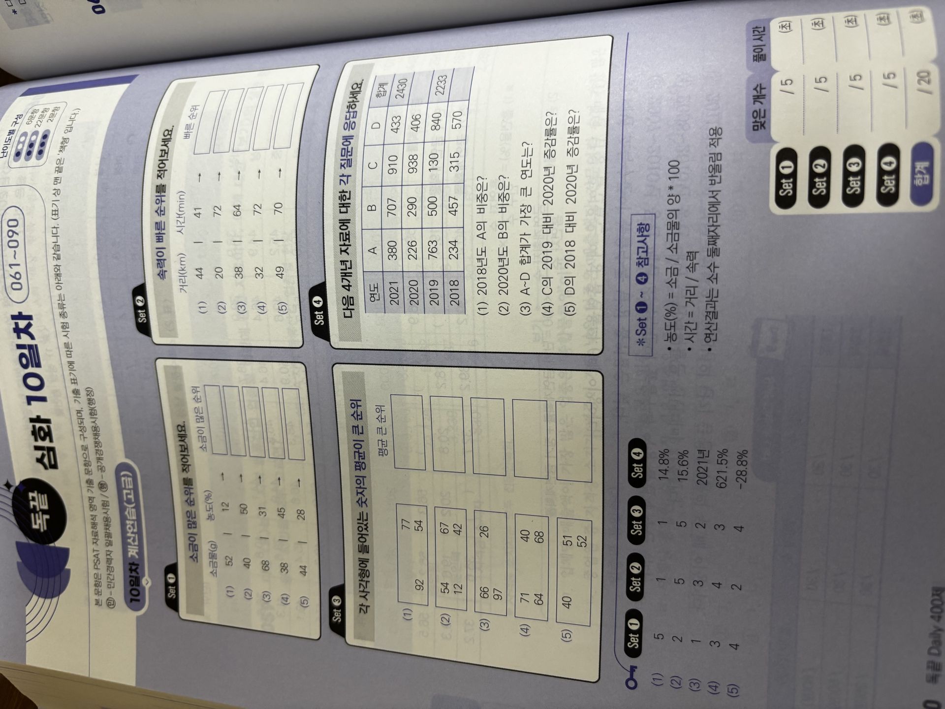 또한 강의에서 배운 비율표를 실제 문제 풀이에 활용하면서 계산 속도와 정확도가 높아졌습니다. 강의를 통해 단순히 문제를 많이 푸는 것이 아니라 효율적인 풀이 방법을 체화하는 시간이었습니다. -