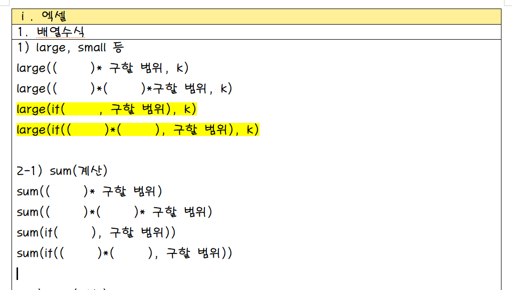 쌍홑쌍쌍홑쌍 공식이라던가, 난생 처음 보는 배열수식 같은 거는 휘발성이 너무 강해서 따로 한글파일로 정리해뒀어요. 그래서 막히거나 하면 파일 연 다음에 쌍홑쌍쌍홑쌍!!! 찾아서 보고 몇 번 되새기고 하다 보면 어느 순간부터 보지 않아도 계속 맞추게 되더라고요!