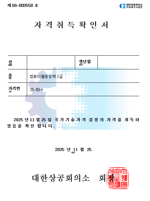 공부를 이어가면서도 지치거나 막힐 때가 있었는데, 선생님의 차분하고 친근한 설명 덕분에 끝까지 포기하지 않고 학습을 이어갈 수 있었습니다. 무엇보다도 “컴활은 꾸준히 연습하면 반드시 합격할 수 있다”는 격려가 큰 힘이 되었습니다.