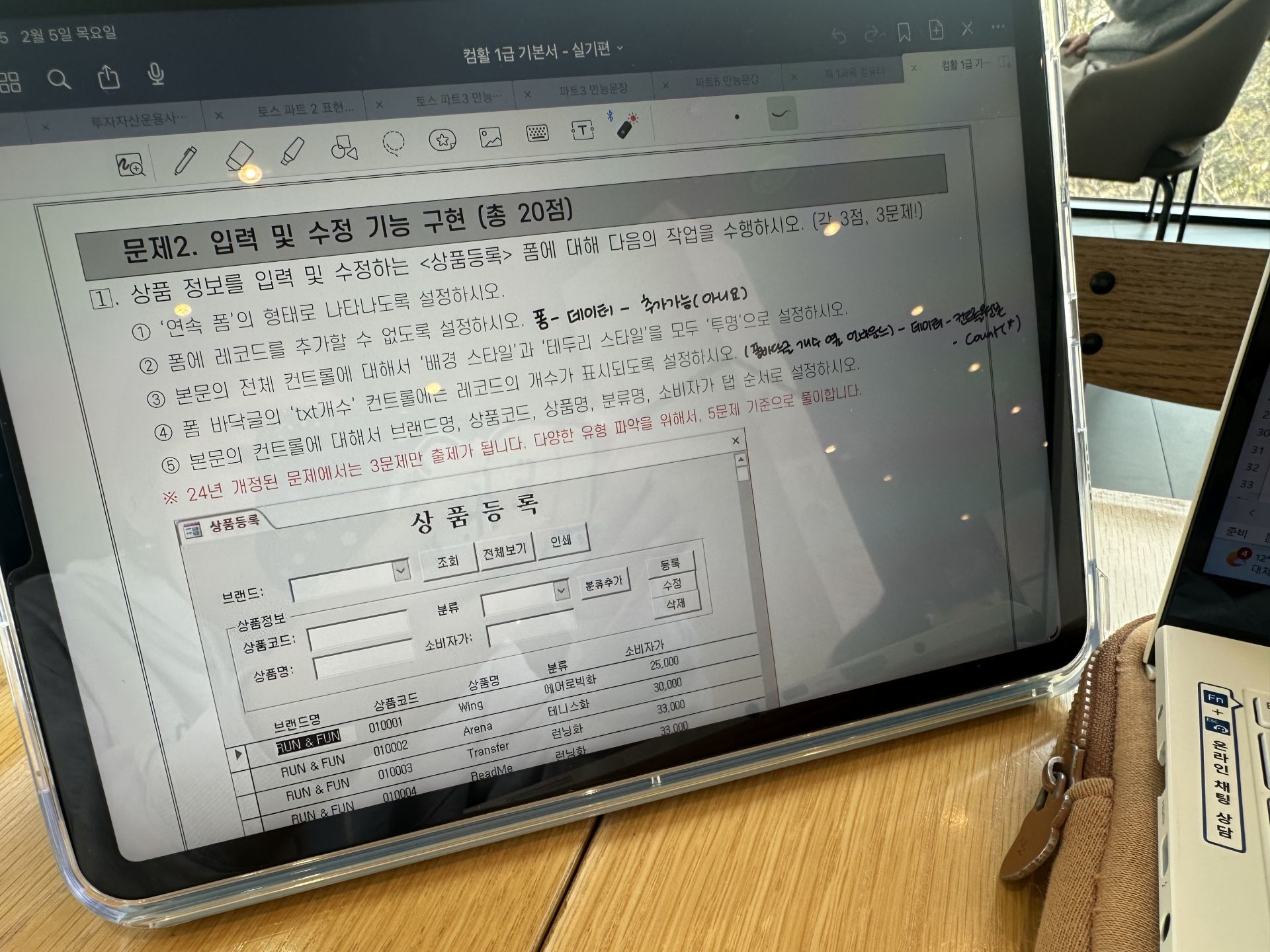 특히 액세스는 처음 들어서 처음에 따라가기 너무 힘든 거에요. 그래서 교재를 하나는 필기 있는 버전, 하나는 필기 없는 버전으로 해서 처음에 할 때는 필기 마구마구해서 밖에서도 쉽게 볼 수 있게 메모를 했구요. 하나는 필기 없는 버전으로 해서 실전처럼 연습할 때 패드 세로로 세운 후에 시험장처럼 연습했습니다!