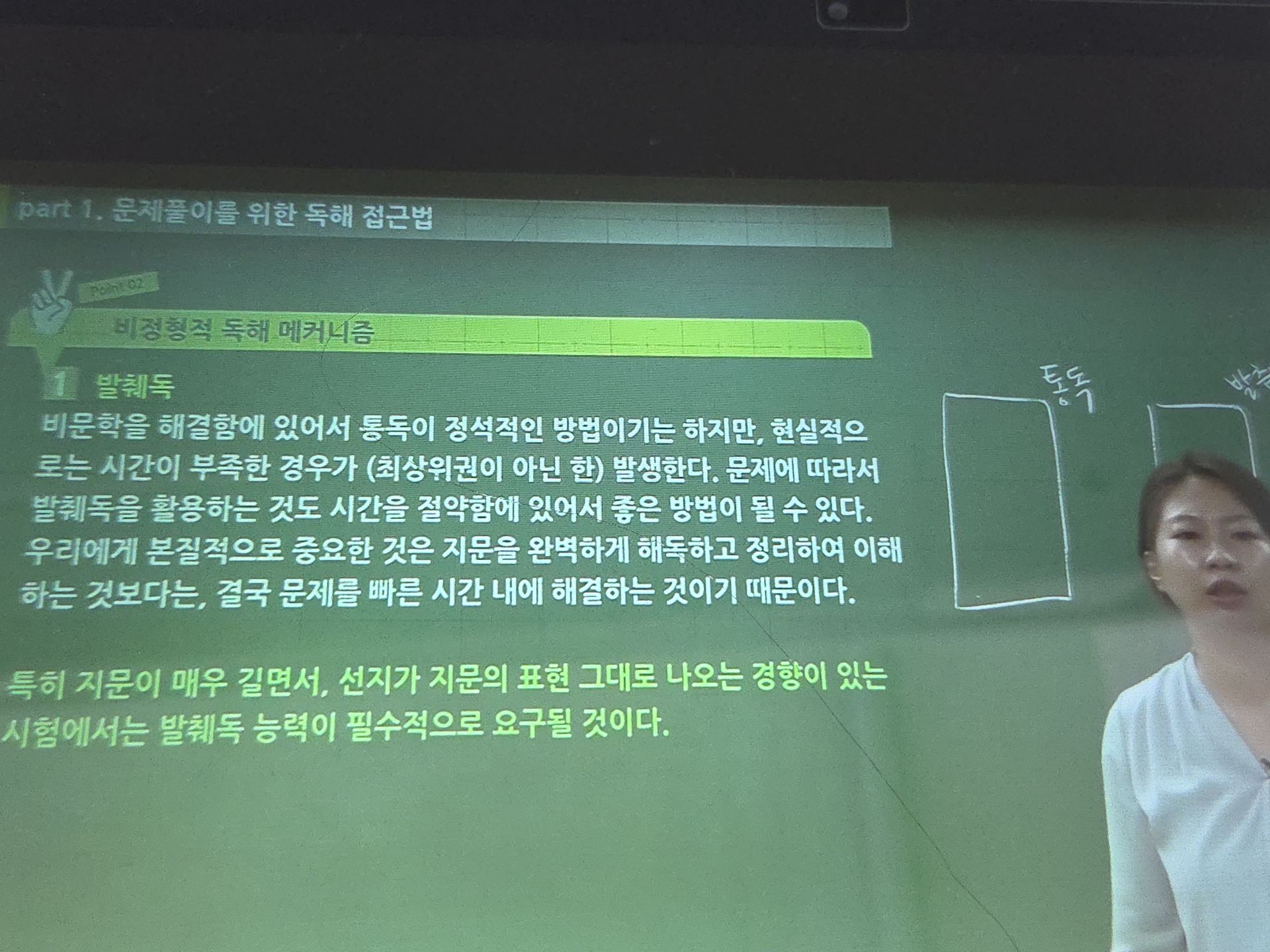 강의는 선생님 딕션이 좋아서 또박또박 잘 들리고, 교재를 화면에 꽉 띄운채 화면공유를 하는 형식으로 진행돼 과외받는 느낌도 들었고 편했다. 또 판서해주는대로 따라가다보면 쉽고 확실하게 내용을 습득할 수 있었다. 교재 해설에는 없는 여러 팁들이나 스킬도 배울 수 있고 더 빠르게 이해할 수 있는데다가 다양한 접근법도 배울 수 있으니 교재와 강의를 같이 활용하는게 좋을 것 같다.
