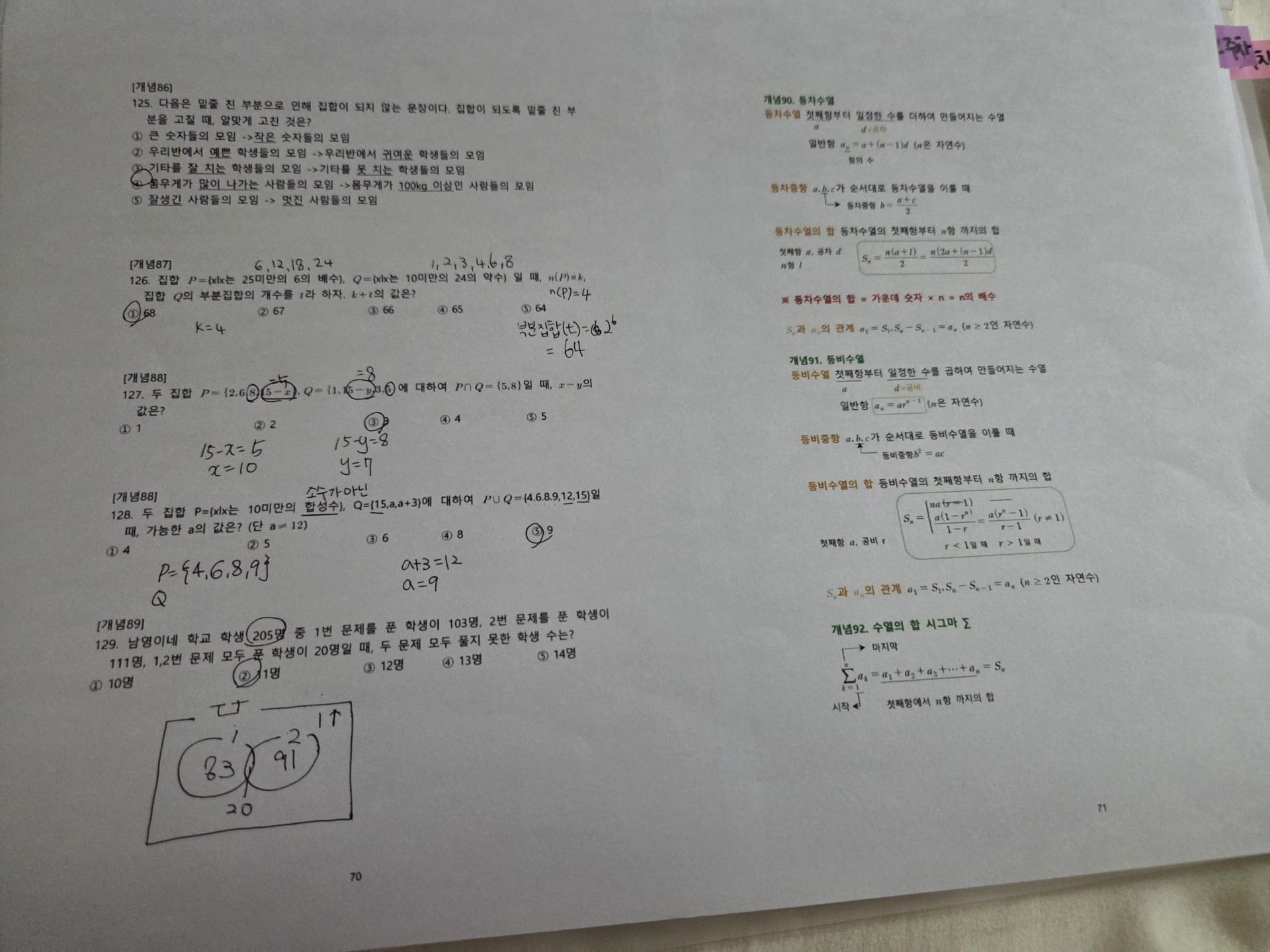 집합과 명제는 논리적 사고를 훈련할 수 있는 좋은 기회였고, 수열 파트에서는 수학적 규칙을 빠르게 도출하는 연습을 했습니다.