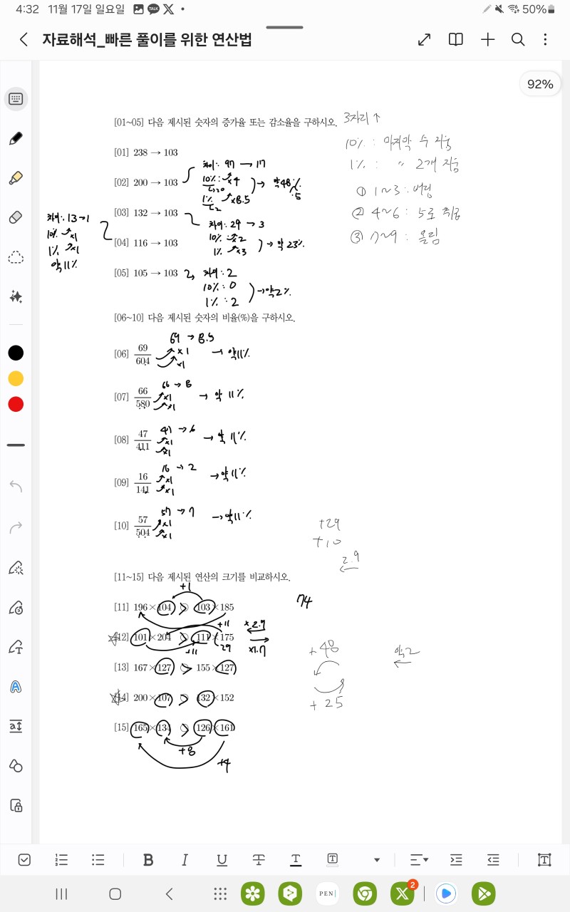 독끝 스터디 과정 2주차에는 박수웅 선생님과 '자료해석'과 '응용수리' 진도를 나갔습니다. 개인적으로 제일 취약하다고 생각하는 파트라 문제를 보기만하면 지레 겁부터 먹곤했는데, 선생님께서 알려주시는 풀이법을 하나하나씩 차근히 따라가다보니 생각보다 쉽게 풀릴 수 있다는 문제라는 점을 깨닫고 신선한 충격을 받은 적이 정말 많습니다... 괜히 명강의,명강사로 불리는 게 아니더라구요 ㅠㅠ bb