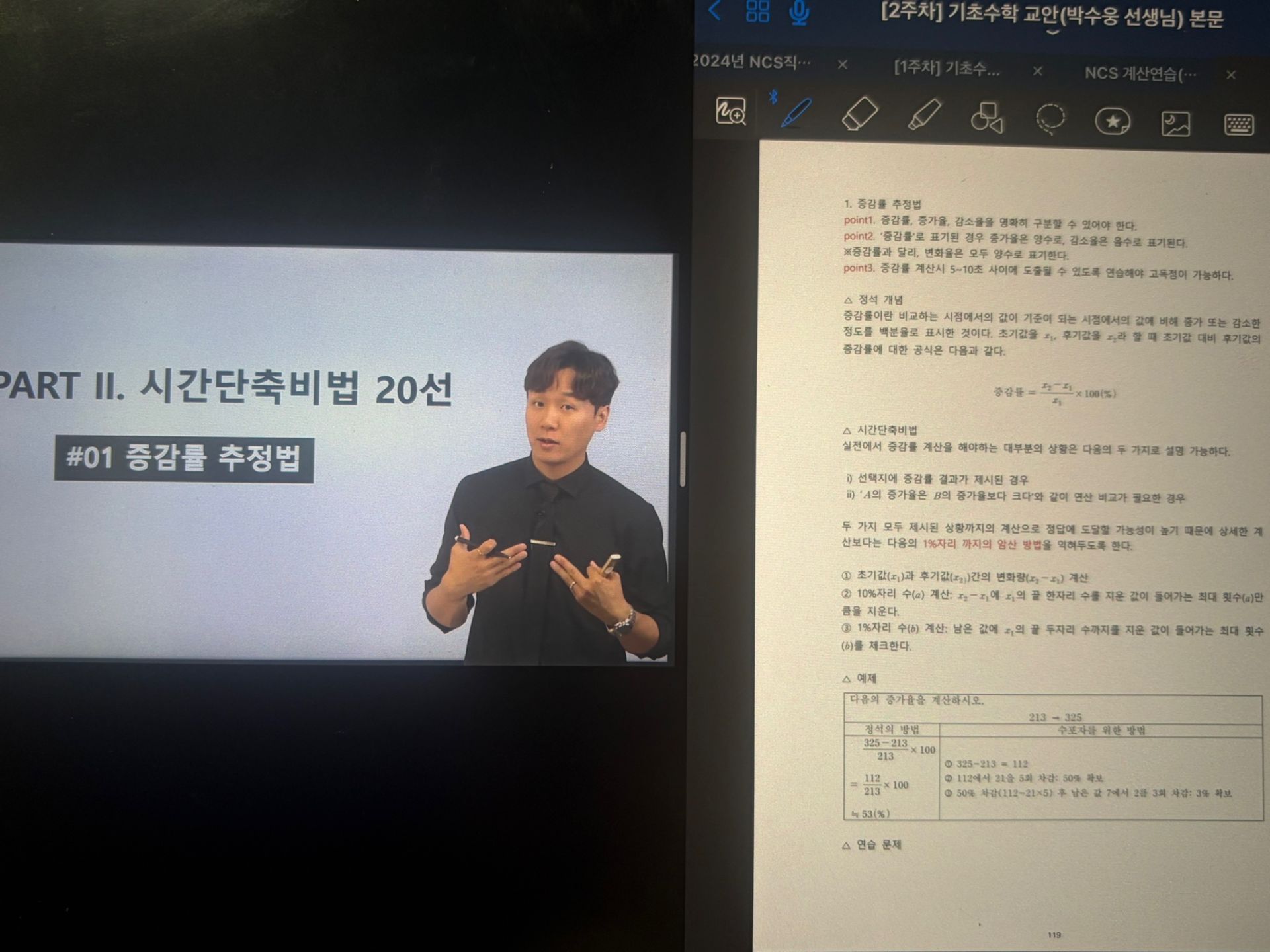 또, 기초 NCS부터 응용수리 파트까지 연결해서 설명해주셔서 좋았습니다. 저는 응용수리에서 특히 약했던 증감률, 거속시, 원가 및 이익금, 일 수 계산, 소금물 농도 유형을 빠르게 푸는 스킬을 배웠는데, 단순 공식 암기보다 “왜 이 방식이 더 빠른지”를 기준으로 풀이 흐름을 정리해주는 점이 도움이 됐습니다. 예를 들어 증감률은 불필요한 계산을 줄이는 변환 방식이 있었고, 거속시는 문제 조건을 정리하는 순서만 바꿔도 시간이 확 줄어드는 게 느껴졌어요.